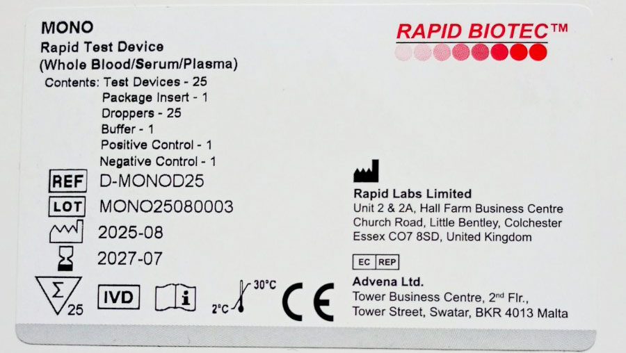 Швидкий тест MONO (цельна кров/сироватка/плазма) — це простий тест, що використовує екстракт еритроцитів великої рогатої худоби для якісного та селективного визначення гетерофільних антитіл інфекційного мононуклеозу в зразках цільної крові, сироватки або плазми протягом кількох хвилин.