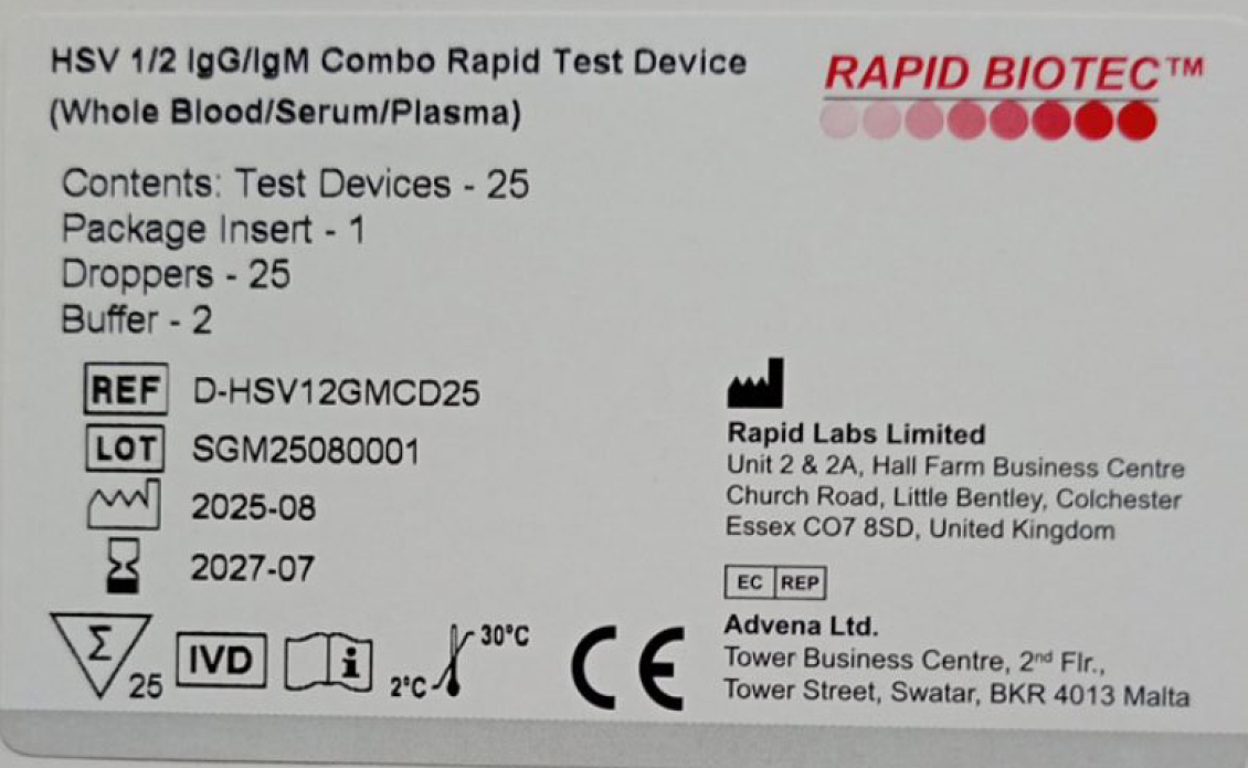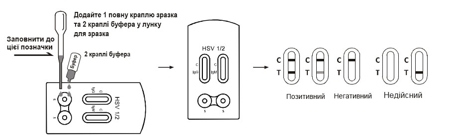 Комбінований швидкий тест HSV 1/2 IgG/IgM Rapid Test Device — це якісний латеральний імунохроматографічний аналіз для виявлення антитіл IgG та IgM до HSV 1/2 у цільній крові, сироватці або плазмі. У тестових зонах нанесений антиген HSV 1/2.