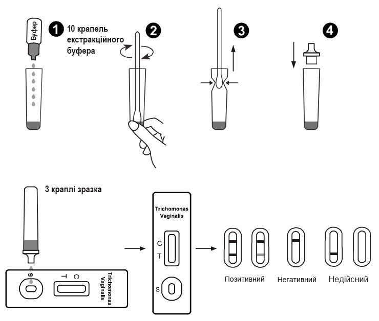 Trichomonas Vaginalis Rapid Test Device — це якісний мембранний імуноаналіз, який визначає антигени T. vaginalis за появою кольорової лінії на тестовій смужці.