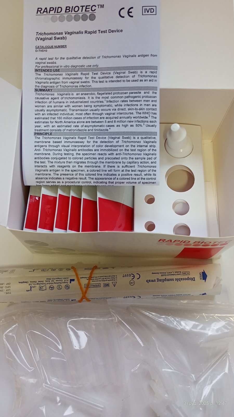 Набір Trichomonas Vaginalis Rapid Test Device (Vaginal Swab) — це швидкий хроматографічний імуноаналіз для якісного виявлення антигену Trichomonas vaginalis у вагінальних мазках.