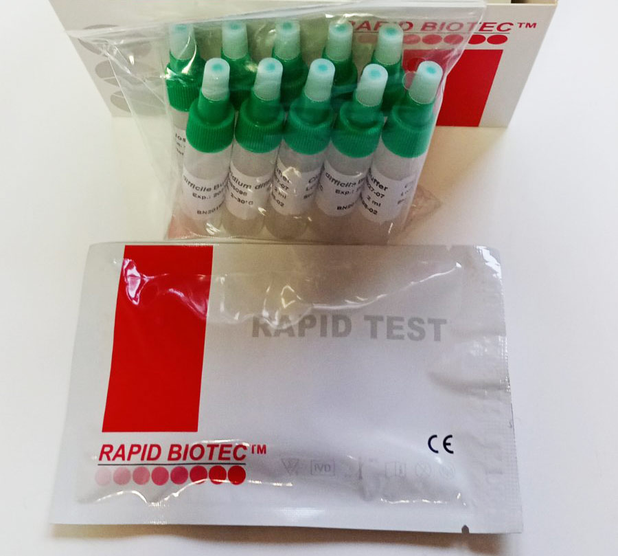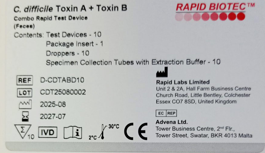 Комбінований швидкий тест C. difficile Toxin A + Toxin B виявляє два різні антигени C. difficile у фекальних зразках — токсин A та токсин B — на двох окремих тест-смужках у межах одного тестового пристрою.